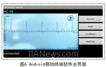 為了方便使用和控制,數(shù)據(jù)傳輸是由接收端發(fā)起的。點擊屏幕中的“receive”按鈕,接收端通過藍(lán)牙向發(fā)送端發(fā)送數(shù)據(jù)傳輸?shù)摹伴_始”信號作為數(shù)據(jù)發(fā)送的起始信號。發(fā)送端在接到發(fā)送的“開始”信號后,便會開始發(fā)送數(shù)據(jù),直到將緩沖區(qū)內(nèi)的數(shù)據(jù)發(fā)送完畢為止,在接收端擁有與發(fā)送端相同大小的緩沖區(qū)接收數(shù)據(jù),當(dāng)接收緩沖區(qū)裝滿后,接收停止。以此來進行數(shù)據(jù)的收發(fā)同步。接收端需要對接收到的數(shù)據(jù)進行檢錯,丟棄錯誤數(shù)據(jù),然后將有效數(shù)據(jù)存入波形顯示緩沖區(qū)中。在屏幕中部可以看到清晰的心電波形圖,如圖6所示。