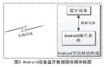 現(xiàn)代社會智能移動終端已經(jīng)成為人們生活中不可或缺的一部分,而目前大部分以手機為代表智能移動終端都是以Android系統(tǒng)為操作平臺并配置有藍(lán)牙裝置,因此為了滿足人們?nèi)粘I钍褂玫男枨笠耘渲糜兴{(lán)牙的智能Android移動終端為數(shù)據(jù)處理和診斷平臺來開發(fā)應(yīng)用程。該應(yīng)用程序以Java語言為主來進行開發(fā)。如圖3所示為Android設(shè)備藍(lán)牙數(shù)據(jù)接收模塊設(shè)計。