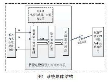 系統(tǒng)總體結(jié)構(gòu)框圖如圖1所示,包括嵌入內(nèi)衣的心電圖導(dǎo)聯(lián)、智能電極信號處理電路模塊、以及配置有藍(lán)牙的智能Android終端應(yīng)用,其中智能電極信號處理模塊包括模擬信號調(diào)理電路、微處理器電路和無線藍(lán)牙網(wǎng)絡(luò)模塊以及可在模塊上擴展體溫傳感器和血氧探頭等,進而擴展生命健康監(jiān)測參數(shù)。