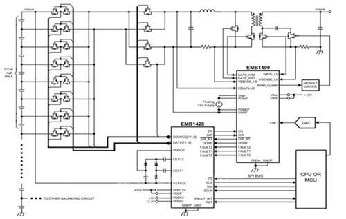 TI在隔離式DC-DC主動均衡技術的能源轉(zhuǎn)換效率高達87%。像EM1410芯片組由5顆核心芯片加上5顆電源供應芯片所組成,其中最主要的EMB1432為十四信道AFE芯片、EMB1428為七信道閘控制器芯片,與EMB1499為七信道電壓控制芯片等,來建構(gòu)十四通道雙向主動式電池芯均衡功能,串聯(lián)14顆電池芯與最高60V工作電壓,提供5V雙向均衡電壓與最大750V堆棧輸出電壓能力,并滿足AECQ-100車用電子驗證標準。