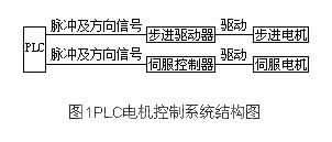 PLC電機(jī)控制系統(tǒng)所用的電機(jī)基本是步進(jìn)電機(jī)和伺服電機(jī)這兩種。這兩種電機(jī)都屬于控制電機(jī),它們的動(dòng)作取決于控制信號(hào),需要步進(jìn)驅(qū)動(dòng)器和伺服控制器來接受控制信號(hào)并將控制信號(hào)進(jìn)行適當(dāng)轉(zhuǎn)換來驅(qū)動(dòng)電機(jī)[2]。因此,PLC產(chǎn)生的控制信號(hào)是實(shí)現(xiàn)控制的關(guān)鍵。這里的控制信號(hào)包括脈沖和方向信號(hào)等。PLC電機(jī)控制系統(tǒng)結(jié)構(gòu)如圖1所示。