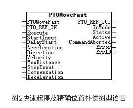以快速起停及精確位置補(bǔ)償為例,此功能塊由外部數(shù)字量信號(hào)觸發(fā),恒定頻率持續(xù)輸出脈沖。啟動(dòng)信號(hào)觸發(fā)后頻率由0開始根據(jù)設(shè)定的加速度增加到目標(biāo)頻率。停止信號(hào)觸發(fā)后,功能塊開始輸出位置補(bǔ)償值,并根據(jù)設(shè)定的減速度在輸出完位置補(bǔ)償值時(shí)減速到0。PTO_REF_IN是對(duì)PTO的參考輸入。Execute是上升沿使能輸入。StartInput是外部啟動(dòng)輸入。DelayStart是運(yùn)動(dòng)執(zhí)行延遲。Acceleration是加速度值。Direction是運(yùn)動(dòng)方向。Velocity是目標(biāo)速度。MaxDistance是運(yùn)動(dòng)執(zhí)行的最大保護(hù)距離。StopInput是外部停止輸入。Compensation是位置補(bǔ)償脈沖值。Deceleration是減速度值。PTO_REF_OUT是對(duì)PTO的參考輸出。InMode是外部輸入觸發(fā)允許。Status是運(yùn)動(dòng)狀態(tài)。Active是外部輸入觸發(fā)執(zhí)行狀態(tài)。CommendAborted是執(zhí)行請(qǐng)求忽略。Error是監(jiān)測(cè)錯(cuò)誤。ErrID是錯(cuò)誤類型。其圖形語言如圖2所示。