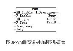 在PWM脈寬調(diào)制的功能塊中,EN_Enable是外部事件觸發(fā)啟動(dòng)PWM輸出使能,F(xiàn)_Enable內(nèi)部變量使能PWM,EN_SYNC是允許硬件觸發(fā)重新啟動(dòng),F(xiàn)_SYNC是通過內(nèi)部變量重啟PWM,F(xiàn)requency是PWM輸出信號(hào)的頻率,Duty是PWM輸出信號(hào)的占空比,InFrequency是PWM指定頻率輸出信號(hào),Busy是布爾變量,頻率或占空比發(fā)生變化輸出TRUE,Error是監(jiān)測(cè)錯(cuò)誤輸出,ErrID是錯(cuò)誤代碼輸出。其圖形語言如圖3所示。