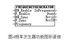 在頻率發(fā)生器功能塊中,EN_Enable是外部使能,若已在頻率發(fā)生器通道配置,則可通過外部事件觸發(fā)啟動(dòng),F(xiàn)_Enable是通過軟件變量使能頻率發(fā)生器,EN_SYNC是允許外部事件重啟頻率發(fā)生器,F(xiàn)_SYNC是通過軟件變量重啟頻率發(fā)生器,F(xiàn)requency是頻率發(fā)生器輸出信號(hào)的頻率。InFrequency是頻率發(fā)生器以指定頻率輸出信號(hào),Busy是布爾變量,如果設(shè)置了啟用命令,并且頻率發(fā)生變化,則設(shè)置為TRUE,如果設(shè)置了InFrequency或Error,或者啟用命令被復(fù)位,則復(fù)位為FALSE,Error是布爾變量,TRUE表示檢測(cè)到一個(gè)錯(cuò)誤,ErrID是檢測(cè)到的錯(cuò)誤代碼,其圖形語言如圖4所示。