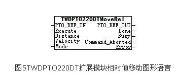 以相對(duì)值移動(dòng)為例,PTO_REF_IN是輸入的模塊通道參考號(hào),Execute是上升沿觸發(fā)執(zhí)行該功能,Distance是目標(biāo)距離,Velocity是目標(biāo)速度,Mode是緩沖模式,0表示中止,1表示緩沖,2表示混合先前,PTO_REF_OUT是輸出的模塊通道參考號(hào),Done表示指令成功完成,Busy表示指令已被接收但還未完成,Command_Aborted表示指令已被其他指令打斷,Error表示指令錯(cuò)誤,其圖形語言如圖5所示。