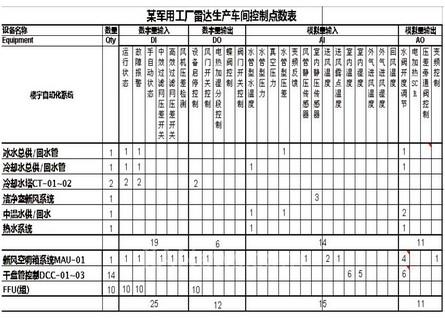 本項目是為某軍用工廠雷達(dá)生產(chǎn)車間所做的控制系統(tǒng),該系統(tǒng)分為水系統(tǒng)、空調(diào)系統(tǒng)和酸堿排氣系統(tǒng)3個子系統(tǒng)。由于該項目生產(chǎn)車間的重要性,在設(shè)計中無塵室規(guī)劃為萬級要求千級施工設(shè)計方案。無塵室的控制精度要求為溫度±0.5度,濕度為±5%。壓力保持房間為+12Pa。項目的控制點數(shù)如下: