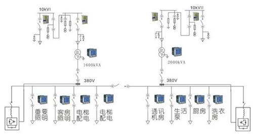 在監(jiān)控系統(tǒng)的設計中,要充分考慮客戶的實際需求,以及電力系統(tǒng)的實際結構、電力系統(tǒng)的實際載荷能力等因素,進而合理的選擇監(jiān)控設備,這既有利于減少系統(tǒng)運作的成本,同時也有利于系統(tǒng)功能的實現(xiàn)。 本項目的電力監(jiān)控系統(tǒng),可以實現(xiàn)對樓內高低壓配電回路的實時監(jiān)控,有利于用電管理。另一方面,電力監(jiān)控系統(tǒng)不僅能夠準確的表示出回路的用電狀況,它還具備網絡通訊等功能,能夠與計算機、串口服務器等設備進行組合,及時的顯示酒店變電所內各個配電回路的運作狀態(tài),保證其供電系統(tǒng)安全可靠、保障各類機電設備的正常工作、提高電力系統(tǒng)的管理效率、提高系統(tǒng)效率,降低電能消耗,延長設備壽命、節(jié)約酒店的電能花費,降低電力運行成本