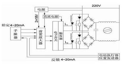 原控制原理框圖如圖1。手操器給定前置磁放大器4~20mA信號,前置磁放大器的線路是直流輸出內反饋推挽線路,給定信號經過和電動執(zhí)行器位置發(fā)送器反饋的4~20mA信號比較后,由電子開關與觸發(fā)器控制電動執(zhí)行器伺服電動機正轉或反轉;同時,電動執(zhí)行器位置發(fā)送器反饋的4~20mA信號,也隨之發(fā)生變化,并把反饋信號送回前置磁放大器進行比較,直到給定與反饋信號平衡為止。由于反饋信號與手操器的顯示和伺服前置磁放大器串聯(lián),因此反饋與給定信號比較的同時,也在手操器上顯示反饋信號的變化過程。