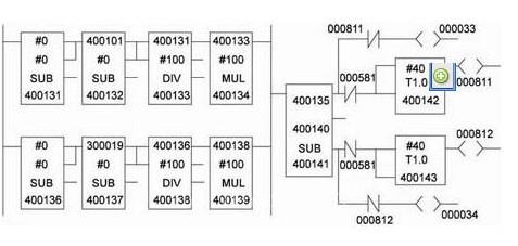 梯形圖程序中“#100”是取整運算值?!?00”實際是控制閥門開度的精度,即死區(qū)控制范圍。在精度要求高的控制中可取“#50”或更小,它相當于伺服前置磁放大器中“穩(wěn)定”電位器的作用。000581為程序中的復位線圈?!?40”為驅動輸出保持40s后,自動斷開輸出。
