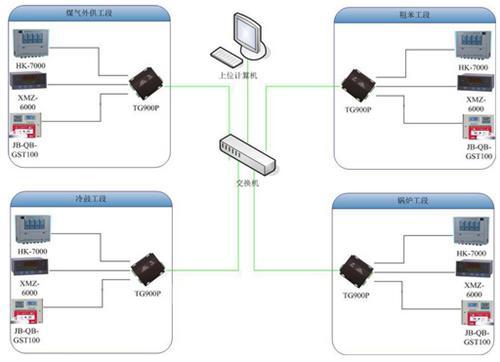 鍋爐工段,智能數(shù)顯表有17臺(485接口)、氣體報警儀8套(485接口)、火災(zāi)報警器1套(485接口),采用一臺TG900P(訂貨時告知串口均定制為485接口),光纖收發(fā)器1臺。
