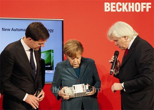 在2014 德國(guó)漢諾威工業(yè)博覽會(huì)上,Hans Beckhoff 先生熱情接待了德國(guó)總理安格拉?默克爾和荷蘭首相馬克?呂特,荷蘭是今年漢諾威工業(yè)博覽會(huì)的合作伙伴國(guó)。