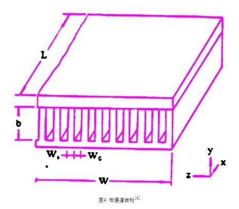 上世紀(jì)80年代中期,美國學(xué)者tucherman和pease報道了一種如圖4所示的微通道結(jié)構(gòu)。該結(jié)構(gòu)由高導(dǎo)熱系數(shù)的材料(例如硅)構(gòu)成。通道寬(wc)和通道壁厚(ws)均為50μm,通道高寬比(b/wc)約為10。在底面(w×l)加上的熱量q經(jīng)過微通道壁傳導(dǎo)至通道內(nèi),然后被強制對流的流體帶走。由于微通道尺寸微小,通道內(nèi)的傳熱規(guī)律與大尺度槽道完全不同。他們的實驗表明當(dāng)水的流量為10cm3/s,水的溫升為71℃時,冷卻熱流高達(dá)790w/cm2。是目前散熱能力最大的水冷裝置。