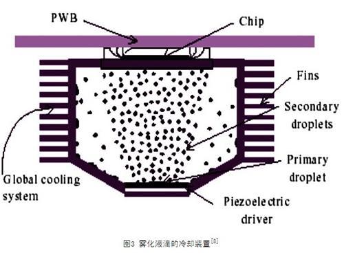 比強制對流冷卻具有更大換熱能力的是沸騰換熱。目前人們已設(shè)計了多種冷卻裝置通過液體的沸騰換熱來冷卻高熱流密度的芯片。heffington等人設(shè)計了一種由振動產(chǎn)生霧化液滴冷卻加熱表面的裝置(vibration-induced droplet atmozation,vida)。裝置結(jié)構(gòu)如圖3所示。該裝置是一個四周裝有散熱片的封閉腔,腔直徑為50mm,厚度為20mm。腔內(nèi)底部裝有壓電致動器和少許液體(水或fc-72)。致動器振動產(chǎn)生霧狀液滴,液滴飛濺到加熱表面,在加熱表面形成持續(xù)的液膜,同時液膜汽化帶走熱量。腔內(nèi)的蒸汽被腔體外表面的散熱器冷卻形成液體,在重力作用下回到腔內(nèi)底部。heffington等人實驗研究的結(jié)果表明,如果腔體外表面采用風(fēng)冷散熱,加熱表面溫度為100℃時,該裝置的最大散熱能力為100w/cm2,如果采用水冷散熱,其散熱能力可達(dá)到200w/cm2。
