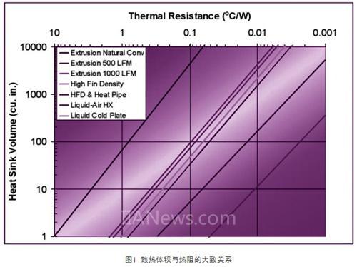 文獻(xiàn)[2]給出了根據(jù)散熱體積和熱阻選擇散熱方式的參考依據(jù),如圖1所示。例如對于熱阻要求為0.01℃/w的散熱方式,如果體積限制在1000in3(1in3=16.4cm3),可以選擇風(fēng)冷散熱方式,但必須配備高效的風(fēng)冷散熱器;而如果體積限制在10in3,只能選擇水冷的散熱方式。