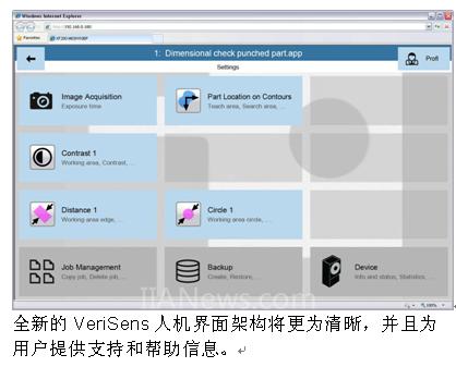 堡盟推出的首款針對視覺傳感器的可配置Web接口為創(chuàng)建更簡化的人機(jī)界面樹立了新的里程碑。全新的2.4版軟件提供了增強(qiáng)型的用戶接口,使得人機(jī)交互操作更加方便。增大的按鈕和相關(guān)特征檢測的短信息文本可為那些經(jīng)常面對小尺寸操作面板的用戶提供更好的支持與幫助?,F(xiàn)在,OEM甚至能夠配置VeriSens Web接口以匹配客戶的公司標(biāo)識規(guī)范,例如公司顏色和商標(biāo)。