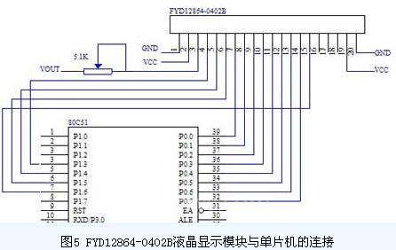 溫濕度顯示電路,采用FYD12864-0402B液晶顯示模塊,它是一種具有4位/8位并行,2線或3線串行多種接口方式,內(nèi)不含有國標(biāo)一級(jí),二級(jí)簡體中文字庫的點(diǎn)陣圖形液晶顯示模塊。其顯示分表率為128*64,內(nèi)置8192個(gè)16*16點(diǎn)漢字和128個(gè)16*8點(diǎn)ASCII字符集,利用模塊靈活的接口方式和簡單方便的操作指令,可構(gòu)成全中文人機(jī)交互圖形界面,可以顯示8*4行16*16點(diǎn)陣的漢字,還可以完成圖形顯示。如圖5所示FYD12864-0402B液晶顯示模塊與單片機(jī)的連接。