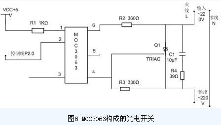 本論題控制部分采用MOC3063來控制加溫系統(tǒng)和灑水系統(tǒng)。MOC3063是一個(gè)過零觸發(fā)的光電雙向可控硅開關(guān),本系統(tǒng)采用的驅(qū)動(dòng)電路如圖6所示: