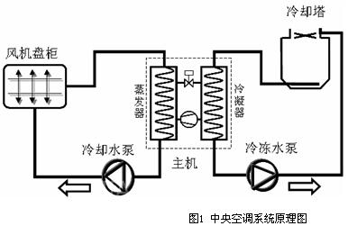 如圖1所示為典型的中央空調(diào)系統(tǒng)圖,主要由冷凍水循環(huán)系統(tǒng)、冷卻水循環(huán)系統(tǒng)及冷凍主機(jī)三部分組成: