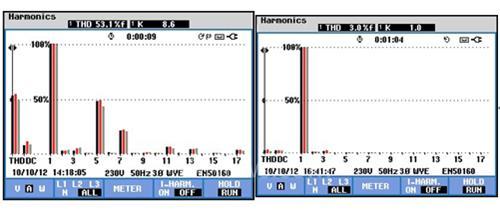 圖6 加裝AFE2000前后抽油電機(jī)諧波電流含量