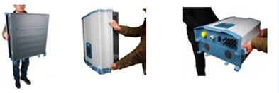 本次臺(tái)達(dá)展示的新一代革命性的RPIM50A組串式逆變器產(chǎn)品,是全世界最小、重量最輕的50kW壁掛式安裝的屋外型逆變器。采用無(wú)隔離變壓器設(shè)計(jì)技術(shù),最高效率達(dá)到98.6%;機(jī)體大小(740x612x278),重量輕(70KG/臺(tái));產(chǎn)品外形設(shè)計(jì)既人性化又非常智能:兩邊設(shè)有便于搬運(yùn)的手握橫條,底部設(shè)有底座,安裝時(shí)兩人可徒手抓住兩側(cè)橫條即可搬運(yùn)或直立于地面,便于快速安裝,見(jiàn)圖如下: