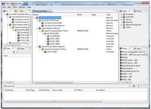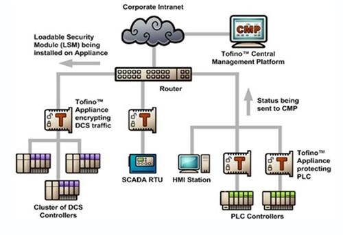 Tofino模塊采用Tofino Central Management Platform (CMP,中央管理平臺(tái))進(jìn)行集中配置、組態(tài)和管理(可遠(yuǎn)程甚至跨國(guó)使用),控制系統(tǒng)網(wǎng)或企業(yè)網(wǎng)均可以在適當(dāng)位置安裝CMP。使用CMP,并裝載各種必要的Loadable Security Modules (LSMs,可裝載安全軟件插件),就可以實(shí)時(shí)在線調(diào)整Tofino模塊,使之滿足所保護(hù)區(qū)域及設(shè)備的安全要求。