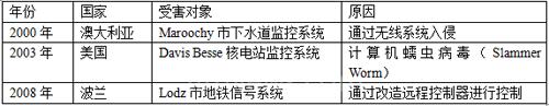 其實(shí),自從進(jìn)入21世紀(jì)之后,就已經(jīng)出現(xiàn)了很多相關(guān)事例。比如,澳大利亞下水道監(jiān)控系統(tǒng)和美國(guó)核電站監(jiān)控系統(tǒng)曾被第三方經(jīng)由無(wú)線網(wǎng)絡(luò)系統(tǒng)侵入,波蘭地鐵信號(hào)系統(tǒng)被入侵(見表1)。近年來(lái),這樣的攻擊案例正在迅速增加。