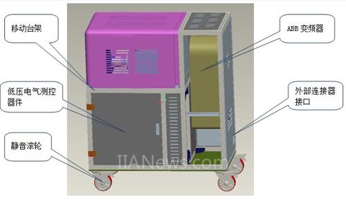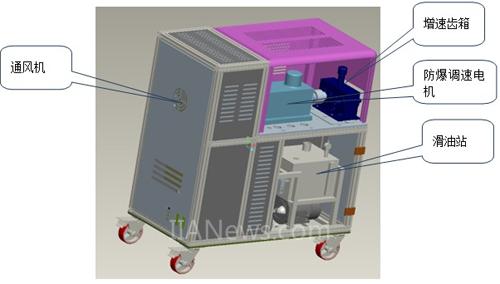 移動(dòng)式電傳裝置由移動(dòng)臺(tái)架、滑油站、防爆調(diào)速電機(jī)、增速齒箱、ABB變頻器、低壓器件等組成。結(jié)構(gòu)如圖1、圖2所示。