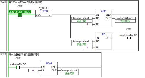 跟一個(gè)變頻器通訊要分別寫啟停指令,寫變頻指令及讀變頻輸出反饋。通過輪詢方式,fasongcishu從1到4輪詢。