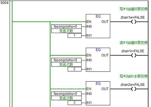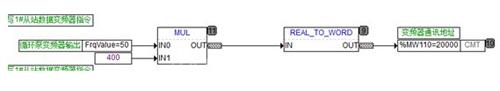 3) Fasongcishu=1,寫循環(huán)泵變頻器啟停指令和變頻輸出指令,=2讀變頻器輸出反饋。