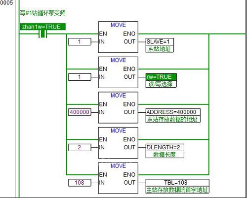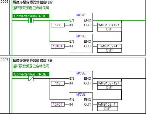 4)寫變頻器邏輯,ABB變頻器從站號(hào)為1,變頻器控制啟停的寄存器為4000000,要寫入的數(shù)據(jù)PLC側(cè)寄存器地址MW108,把啟停指令提前放入MW108即可。