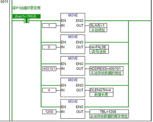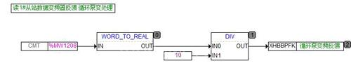 5)讀變頻器輸出反饋,變頻器輸出反饋指令存放于400101寄存器,讀到PLC后存放到MW1208。