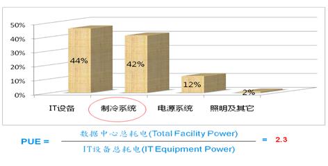 數(shù)據(jù)中心的基礎(chǔ)設(shè)施核心保障就是IT設(shè)備,形象的說建設(shè)數(shù)據(jù)中心就是為了解決IT設(shè)備的“吃”、“住”、“舒適”等生活問題,吃的是UPS的不間斷電源,住的是高檔機(jī)柜,享受的是精密空調(diào),當(dāng)然要實(shí)現(xiàn)這些就需要付出相應(yīng)的成本,其中數(shù)據(jù)機(jī)房的電費(fèi)是目前企業(yè)級(jí)機(jī)房最大的營(yíng)業(yè)成本之一,為了解決耗電問題,我們先分析能耗的組成,才能對(duì)癥下藥,一個(gè)典型的PUE=2.3的機(jī)房耗電組成如下所示: