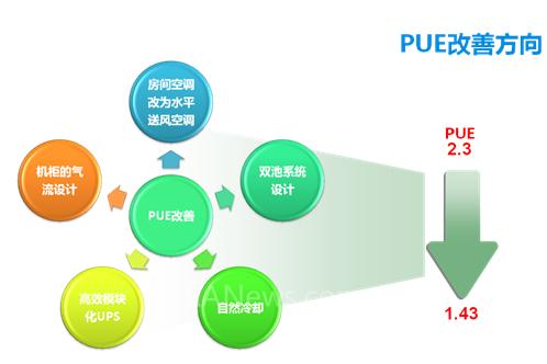 根據(jù)以上耗電系統(tǒng)分析,PUE主要的改善方向如下: