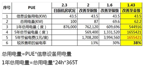 以一個(gè)總功率100kW的機(jī)房為例,PUE從2.3改善到1.43,一年能節(jié)約30多萬(wàn)度電,5年就可以節(jié)約165萬(wàn)元的電費(fèi),為企業(yè)更高效的運(yùn)營(yíng)提供有力的支持。