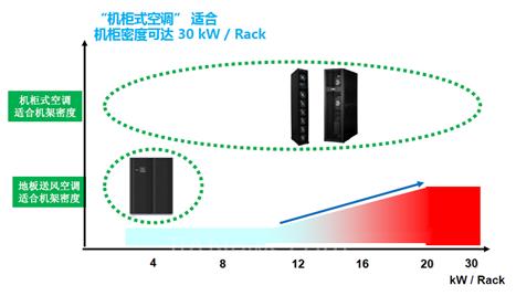 從圖中,我們可以看出傳統(tǒng)下送風(fēng)空調(diào),滿足單機(jī)柜6kw一下的需求,而水平送風(fēng)空調(diào)可滿足單機(jī)柜30kw一下的需求。