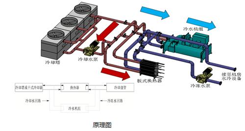 自然冷卻技術(shù)就是利用免費(fèi)的自然資源進(jìn)行熱交換,最大限度的降低機(jī)房能耗,目前常用的免費(fèi)冷源主要是冬季或春秋季的室外空氣。因此,如果可能的話,數(shù)據(jù)中心的選址應(yīng)該在天氣比較寒冷或低溫時(shí)間比較長(zhǎng)的地區(qū)。在中國(guó),北方地區(qū)都是非常適合采用免費(fèi)制冷技術(shù)。采用水冷空調(diào)系統(tǒng),當(dāng)室外環(huán)境溫度較低時(shí),在低于15度以下(上海地區(qū)每年約有120天)就關(guān)閉制冷機(jī)組,可以利用冷卻塔、冷卻水泵、板式換熱器組成的系統(tǒng)進(jìn)行熱交換,因系統(tǒng)中沒有大功率的壓縮機(jī)運(yùn)轉(zhuǎn),極大的降低了系統(tǒng)的效率,當(dāng)溫度高于15度又切換回冷凍水系統(tǒng)。上述介紹的水冷自然冷卻由于只需要增加一臺(tái)不需要?jiǎng)恿Φ陌迨綋Q熱器,投資和占地都比較少,是我們推薦的企業(yè)數(shù)據(jù)中心最佳免費(fèi)制冷節(jié)能方案,系統(tǒng)的原理圖如下。