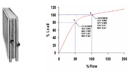 實(shí)現(xiàn)節(jié)能的原理:低流量大溫差與熱交換能力的關(guān)系,對(duì)于一個(gè)換熱器(板換或者精密空調(diào)表冷器)來(lái)說,其流量與溫差的關(guān)系見下圖,在部分負(fù)荷下,其冷量與流量不會(huì)同比下降,如圖,在50%的流量下,可以提供大約80%的負(fù)荷,也就是說系統(tǒng)的冷量與流量不會(huì)完全對(duì)應(yīng),但是每個(gè)廠家的換熱器性能不一定,故最佳換熱流量并不統(tǒng)一,這個(gè)最佳流量基本會(huì)在30%-70%之間,使得溫差最大會(huì)高于5℃。