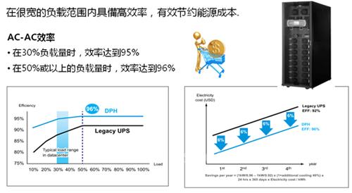 ■ 采用轉(zhuǎn)換效率高的UPS系統(tǒng)。目前,新一代數(shù)據(jù)中心的設(shè)計(jì)基本采用新型的高頻(IGBT技術(shù))UPS系統(tǒng),電源轉(zhuǎn)換效率和功率因數(shù)都比傳統(tǒng)的工頻(可控硅技術(shù))UPS系統(tǒng)有非常大的提升,而且重量輕和體積小。由于UPS的電源轉(zhuǎn)換效率和負(fù)載率成正向關(guān)系,因此在設(shè)計(jì)和運(yùn)維時(shí)要盡可能提高UPS的負(fù)載率。