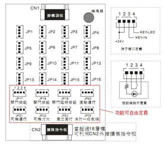 根據(jù)客戶要求,開關(guān)門按鈕可以同時控制前后門。其中,JP17和JP18為前門開、關(guān)門按鈕功能。現(xiàn)場自定義JP19、JP20為后門開、關(guān)門按鈕功能,其設(shè)定參數(shù)為10-18= 25(指令板1 I3功能,設(shè)定為后門開門按鈕)和10-19= 26(指令板1 I4功能,設(shè)定為后門關(guān)門按鈕),從而按客戶目的實現(xiàn)開關(guān)門按鈕可以同時控制前后門。EA-CP16指令板功能默認(rèn)設(shè)定如圖4所示。