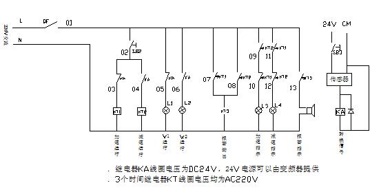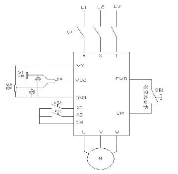 如以上圖一圖二所示, SB1-SB3為控制箱面板三個(gè)轉(zhuǎn)換按鈕,分別控制變頻器的啟動(dòng),加減速的投入啟動(dòng)及傳感器的啟動(dòng)。KT1-KT3分別控制UP/DW端子投入時(shí)間及報(bào)警的時(shí)間,正常運(yùn)行設(shè)置中,第二速度比第一速度高。兩段速度的設(shè)定值在控制箱的面板上由兩塊10V指示表分別顯示。