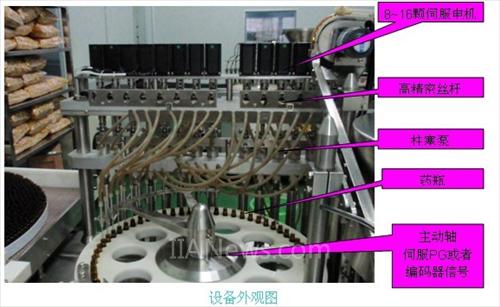 伺服的灌裝要和主動(dòng)軸速度保持同步,主軸送瓶速度快灌裝伺服的速度也要快,伺服要有判斷功能,當(dāng)檢測(cè)到?jīng)]有藥瓶時(shí)相應(yīng)的灌裝伺服不動(dòng)作。