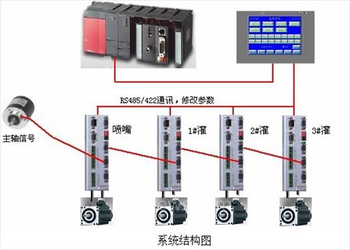 噴嘴伺服驅(qū)動(dòng)器encoder out接口輸出送料電機(jī)電機(jī)編碼器信號(hào),反饋到灌裝伺服驅(qū)動(dòng)器 master encoder(主編碼器輸入)中,以此類推接入其余的伺服。系統(tǒng)結(jié)構(gòu)示意圖如下