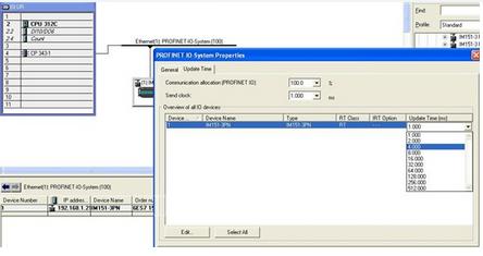 第8步,配置IM151-3PN的更新時間,這個更新時間是根據(jù)設(shè)備的性能決定的,性能好的設(shè)備更新時間可達(dá)1ms,有的廠商提供的PROFINET IO設(shè)備最多也只能有8ms的更新時間,如圖3-8所示: