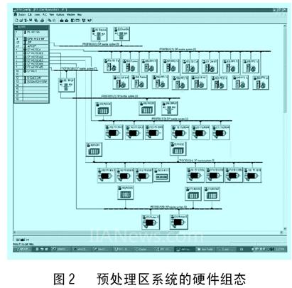 通過Profibus-DP網連接,整個系統(tǒng)構成了一個全數字、全網絡化系統(tǒng),成為能完成組態(tài)、運行、操作等功能的完整的控制網絡系統(tǒng)。預處理區(qū)系統(tǒng)的硬件組態(tài)如圖2所示。