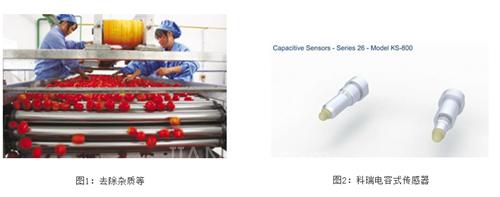番茄醬的生產(chǎn)工序有:清洗,粉碎,去除雜質(zhì),配料,攪拌,灌裝,包裝等工序,在每個(gè)生產(chǎn)工序中,都會(huì)用到各類傳感器。其中,電容式傳感器用于各個(gè)儲(chǔ)存罐子中的高低限位,如對(duì)調(diào)料罐子,番茄醬原漿罐子,醋罐,食用油罐子等液位監(jiān)測(如圖3 中各個(gè)工藝的介紹)。