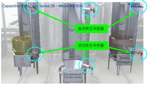 在圖4 中分別介紹了食用油,醋和番茄醬原漿罐中傳感器的安裝位置。傳感器用于各個(gè)罐子的高液位和低液位監(jiān)測,如,當(dāng)?shù)鸵何粓?bào)警后,說明此罐子已經(jīng)空了,需要補(bǔ)充物料;直到高料位有信號(hào)變化時(shí),說明此罐子已經(jīng)加滿,停止補(bǔ)充物料。這些傳感器主要是保證每個(gè)罐子里都有物料,滿足繼續(xù)生產(chǎn)的需要。