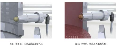 在這些物料罐子中,如食用油,番茄醬原漿,混合漿等罐子都會(huì)產(chǎn)生物料掛壁問題,這些物料的掛壁,會(huì)干擾到普通電容式傳感器的檢測,很容易出現(xiàn)失靈的現(xiàn)象。因?yàn)槠胀ǖ碾娙菔絺鞲衅鞑荒軈^(qū)分出感應(yīng)面上的物料是掛壁的物料還是實(shí)際物料。針對(duì)這個(gè)問題,只有用KS-700/800系列電容式傳感器,才能有效解決問物料掛壁問題(如圖5和圖6,物料掛壁的前后對(duì)比)。