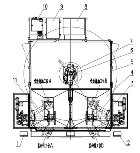 該系統(tǒng)設(shè)有A、B兩個工位。每個工位設(shè)置有一套轉(zhuǎn)臂及轉(zhuǎn)臺,兩套轉(zhuǎn)臂及轉(zhuǎn)臺對稱設(shè)置。每個轉(zhuǎn)臺通過轉(zhuǎn)臂動作可轉(zhuǎn)到噴涂施釉工位和裝卸件工位。當(dāng)一個轉(zhuǎn)臺轉(zhuǎn)到噴涂施釉工位,機器人對該轉(zhuǎn)臺上工件進行噴涂工作時,另一轉(zhuǎn)臺可以轉(zhuǎn)出工作間、轉(zhuǎn)到裝卸件工位,并在人工卸下噴涂好的工件、換上新的待噴涂工件后再轉(zhuǎn)回到工作間內(nèi)的噴涂工位,等機器人噴涂完前一轉(zhuǎn)臺上工件后,馬上對該轉(zhuǎn)臺上的工件進行噴涂。機器人如此交叉作業(yè),可以提高機器人的使用效率。