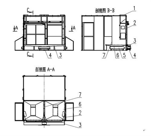 收釉裝置由兩套室內(nèi)收釉漏斗(6)、兩輛室內(nèi)收釉小車(5)、一套室外收釉漏斗(3)、一輛室外收釉小車(4)和工位隔板(7)、側(cè)墻板等構(gòu)成。