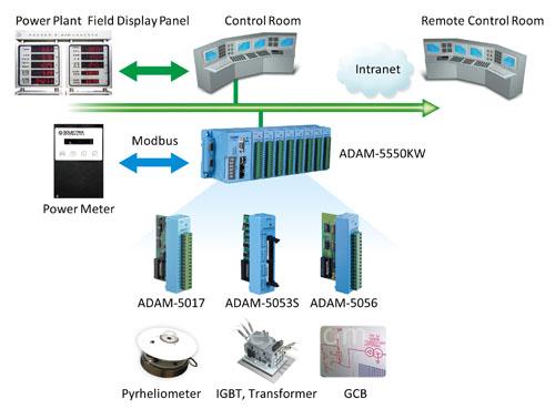 為精確計(jì)算光照度,評(píng)估太陽(yáng)能板效能,興達(dá)電廠需采用一個(gè)強(qiáng)固、緊湊的控制器,來(lái)滿足其控制、模擬信號(hào)量測(cè)、快速的數(shù)據(jù)抽樣、記錄、分析,遠(yuǎn)程配置及維護(hù)等需求。經(jīng)多方面考量,興達(dá)電廠選用研華的PAC產(chǎn)品作為其控制器,其具備快速的測(cè)量、記錄、控制、存儲(chǔ)及遠(yuǎn)程維護(hù)功能,充分滿足興達(dá)電廠之需求。ADAM-5550KW具備上述功能以外,提供多功能數(shù)據(jù)采集模塊。其本身提供的專業(yè)軟件SoftLogic讓工程師在程序設(shè)計(jì)時(shí)運(yùn)用自如。模擬量輸入模塊用于量測(cè)太陽(yáng)能板溫度、日照度、遮陰溫度等;數(shù)字量輸入模塊負(fù)責(zé)量測(cè)設(shè)備的狀態(tài)參數(shù),如溫度、電壓;系統(tǒng)異常時(shí)的火警、斷路器的跳脫、直流/交流電壓過(guò)低等的監(jiān)測(cè)。數(shù)字量輸出模塊負(fù)責(zé)控制氣體斷路器的狀態(tài)控制,進(jìn)行市電的并聯(lián)任務(wù)。